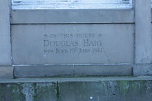 Haig was born in a house on Charlotte Square, Edinburgh, (but with postal address 19 Hope Street, the side street to the south-west; a plaque exists).[14] His father John Richard Haig — an alcoholic — was said to be "in trade", though as head of the family's successful Haig & Haig whisky distillery, he had an income of £10,000 per year (£1,160,000 in 2018), an enormous amount at the time.[15] His mother, Rachel (daughter of Hugh Veitch of Stewartfield),[16] was from a gentry family fallen into straitened circumstances.[17] Rachel's cousin, Violet Veitch, was mother of the playwright, composer and performer Noël Coward.[18] The family home was Haig House in Windygates, Fife.[19]