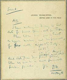 In his much-criticised memoirs 1914, French later claimed that Haig had wanted to postpone sending the BEF, which may be partly true, in view of what Haig had written to Haldane at the time. Haig was so angry at this claim that he asked Cabinet Secretary Maurice Hankey to correct French's "inaccuracies". However Haig also rewrote his diary from this period, possibly to show himself in a better light and French in a poor one. The original manuscript diary for early August does not survive but there is no positive evidence that it was destroyed; and it has been pointed out that it is just as likely that the extant typed version was prepared from dictation or notes now lost.[85] Hankey's notes of the meeting record that Haig suggested delaying or sending smaller forces, but was willing to send forces if France was in danger of defeat or if France wanted them (which it did). Haig predicted that the war would last several years and that an army of a million men, trained by officers and NCOs withdrawn from the BEF, would be needed.[84]