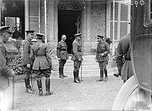 After a fortnight of intense fighting I Corps had been reduced from 18,000 men to just under 3,000 effectives by 12 November.[96] After six days of bickering between British and French generals, I Corps was relieved by French troops; Haig being very suspicious of the pro-French sympathies of Henry Wilson.[97] Following the success of the First Battle of Ypres, French, who had been ordered by his doctor to rest to relieve the strain on his heart, recommended Haig for immediate promotion to general. Haig travelled to London on French's behalf (23 November) to consult Kitchener about the plan to expand the BEF and reorganise it into two armies.[98]