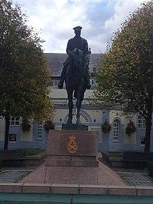 On 15 October, later than proposed after two weeks of friction between British and French generals, Haig's I Corps was moved to Ypres in Flanders as part of the "Race to the Sea".[93] In the belief that the German northern flank was weak, Haig was ordered to march on Ghent, Bruges and Courtrai in western Belgium but the new German Chief of Staff Falkenhayn was trying to do the opposite and roll up the Allied northern flank. I Corps marched headlong into a thrust westward by fresh German forces and the result was the First Battle of Ypres. German forces, equipped with 250 heavy guns (a large number for this early stage in the war), outnumbered I Corps by two to one and came close to success. At one point Haig mounted his white horse to encourage his men, who were retreating around Gheluvelt, although in the event the town had just been recaptured by a battalion of the Worcesters before Haig's ride.[94] Haig cemented his reputation at this battle and Ypres remained a symbolic piece of ground in later years. Haig was also influenced by the fact that the Germans had called off their offensive when they were on the verge of success, and he drew the lesson that attacks needed to be kept up so long as there was any chance of success.[95]