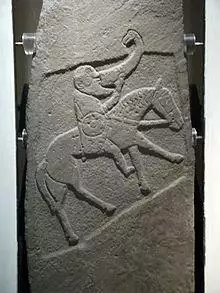 Scythian drinking horns have been found almost exclusively in warrior burials. This has been taken as strongly suggesting an association of the drinking horn with the Scythian cult of kingship and warrior ethos. In the influential interpretation due to M. I. Rostovtzeff (1913), the Scythian ruler received the drinking horn from a deity as a symbol of his investiture. This interpretation is based on a number of depictions of a Scythian warrior drinking from a horn standing or kneeling next to a seated woman.[12] Rolle (1980) interpreted the woman not as a goddess but as a high-ranking Scythian woman performing a ritual office.[13] Krausse (1996) interpreted the same scenes as depicting a marriage ceremony, with the man drinking from the horn as part of an oath ritual comparable to the scenes of Scythian warriors jointly drinking from a horn in an oath of blood brotherhood.[14] The Scythian drinking horns are clearly associated with the consumption of wine.[15]