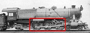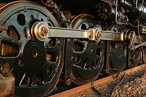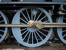 On a steam locomotive, a driving wheel is a powered wheel which is driven by the locomotive's pistons (or turbine, in the case of a steam turbine locomotive).[1] On a conventional, non-articulated locomotive, the driving wheels are all coupled together with side rods (also known as coupling rods); normally one pair is directly driven by the main rod (or connecting rod) which is connected to the end of the piston rod; power is transmitted to the others through the side rods.[2][3][4]