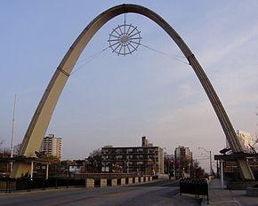 The southern end of Dufferin is the Dufferin Gates within the Exhibition Place, which holds the annual Canadian National Exhibition (CNE). The two Dufferin Street bridges connect the Exhibition Place with the rest of Dufferin Street to the north. The 1911 bridge span across the railway north of the CNE grounds was determined to be unsafe for vehicular traffic in 2013, and was closed to vehicles. The bridge was scheduled for replacement starting in 2016.[3] The City of Toronto plans to build a temporary bridge to restore vehicular traffic in advance of the replacement construction.[4]