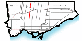 North of Wilson Avenue, Dufferin is interrupted by Downsview Airport and Allen Road, the latter of which feeds Dufferin north of Kennard Avenue (formerly Wilson Heights Boulevard), north of Sheppard Avenue.
