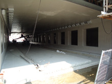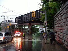 The jog was eliminated in 2010 with the construction of a four-lane underpass beneath the railroad track, including public art and an amphitheatre-styled park with tiered gardens at the southwest corner of the underpass. This project was approved by city council in 2007, and work on extending the roadway began in July 2009.[6] The underpass was opened on November 18, 2010.[7] A further widening of the north side of the bridge was completed in 2016–2017 to support expanded GO Transit train service.[8]