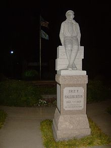 Duncan once adopted the slogan, "The Buckle on the Oil Belt". Its main claim to fame is as the birthplace of the Halliburton Corporation.[6] Erle P. Halliburton perfected a new method of cementing wells, making oil production much easier and more profitable, and established the New Method Oil Well Cementing Company in 1919. He died in 1957, at which time the company had 201 offices in 22 states and 20 foreign countries. Halliburton maintains seven different complexes in Duncan plus an employee recreational park, but the corporate offices relocated first to Dallas and later to Houston.