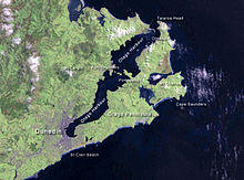 To the east of Dunedin lies the entirety of the Otago Peninsula, a long finger of land that formed the southeastern rim of the Dunedin Volcano.[56] The peninsula is lightly settled, almost entirely along the harbour coast, and much of it is maintained as a natural habitat by the Otago Peninsula Trust. The peninsula contains several fine beaches, and is home to a considerable number of rare species including Yellow-eyed and Little penguins, seals, and shags. Taiaroa Head on the peninsula's northeastern point is a site of global ecological significance as it is home to the world's only mainland breeding colony of royal albatross.