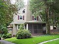 Settlers of the Dutch colonies in New York, Delaware, New Jersey, and western Connecticut built these homes in ways familiar to the regions of Europe from which they came, like the Low Countries, the Palatine parts of Germany, and Huguenot regions of France.[2] Used for its modern meaning of "gambrel-roofed house", the term does not reflect the fact that housing styles in Dutch-founded communities in New York evolved over time. In the Hudson Valley, for example, the use of brick, or brick and stone is perhaps more characteristic of Dutch Colonial houses than is their use of a gambrel roof. In Albany and Ulster Counties, frame houses were almost unknown before 1776, while in Dutchess and Westchester Counties, the presence of a greater proportion of settlers with English roots popularised more construction of wood-frame houses.[3]:22 After a period of log cabin and bank-dugout construction, the use of the inverted "V" roof shape was common. The gambrel roof was used later, predominantly between 1725 and 1775, although examples can be found from as early as 1705.[3]:23 The general rule before 1776 was to build houses that were only one-and-a-half stories high, except in Albany, where there were a greater proportion of two-story houses. Fine examples of these houses can be found today, like those in the Huguenot Street Historic District of New Paltz, New York.