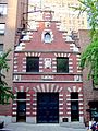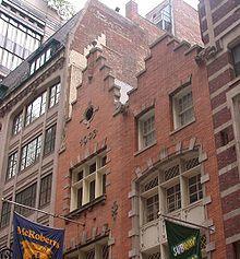 Examples of urban style of Dutch Colonial Revival architecture can be found in Manhattan, New York. 57 Stone Street was rebuilt in 1903 by C. P. H. Gilbert on behest of the owner Amos F. Eno. The buildings to the back on South William Street 13–23 also were reconstructed in the Dutch revival style, evoking New Amsterdam with the use of red brick as building material and the features of stepped gables.[10] Stepped gables on early 20th-century Dutch Revival buildings on S William Street in Lower Manhattan recall the Dutch origins of the city. The area was declared a historic district in 1996 by the New York City Landmarks Preservation Commission.[11]