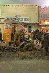 Several early attempts were made to produce oil in the area, beginning in 1911, with the failed Millville Oil Company, but drilling technology had not progressed sufficiently to reach oil at the depths it is found there, which are mainly below 3,501 feet (1,067 m); most early wells ended in broken bits, dry holes, and bankrupt operators. Finally, an enterprising Alabama man, Columbus Marion (Dad) Joiner, was the first with enough persistence to succeed, and on October 3, 1930, his Daisy Bradford No. 3 well (named after the widow who owned the farm) hit oil at 3,536 feet (1,078 m) below ground surface.[9] The well is located near the southeastern boundary of the oil field. This was the third well Joiner drilled, the first was abandoned at 1,098 feet (335 m) in February 1928, the second at 2,518 feet (767 m) in March 1929, but the second did show gas below 1,400 feet (430 m). Joiner employed the driller Ed Laster for the third well, which was spudded in May 1929, only 375 feet (114 m) from the second site. Only about 100 metres (330 ft) separated the second site from the first site. On 20 July 1930, Laster took a core sample at 3,411 feet (1,040 m), which showed 9 inches (23 cm) of oil sand. On 5 September 1930, a drill stem test at 3,486 feet (1,063 m) showed oil and gas. By 2 October, the casing was cemented in, and the well was ready to be brought in, with over 8000 persons on hand to bear witness. On 5 October, oil gushed over the derrick before Laster directed the 6800 BOPD flow into storage tanks.[10]:29–39,54–67,77,108