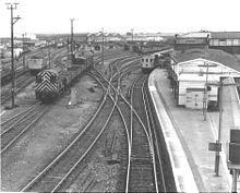 Adjacent to the locomotive works was a very large 15-road engine shed which was opened in 1903 and closed in 1967.[21] This depot was one of the largest on the SR: in 1946 its allocation was 131 engines of extraordinary variety in age and origin:- 17 4-6-0, 31 4-4-0, 7 2-6-0, 19 0-6-0, 15 0-4-2, 1 0-8-0T, 13 0-6-0T, 23 0-4-4T and 5 0-4-0T. Although closed as a TMD, the site was used for scrapping engines as late as 2003.