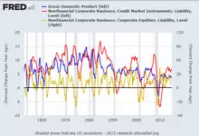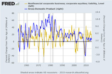 Corporate equities as leading indicator with respect to GDP. - Money Supply (M2) — The money supply measures demand deposits, traveler's checks, savings deposits, currency, money market accounts, and small-denomination time deposits. Here, M2 is adjusted for inflation by means of the deflator published by the federal government in the GDP report. Bank lending, a factor contributing to account deposits, usually declines when inflation increases faster than the money supply, which can make economic expansion more difficult. Thus, an increase in demand deposits will indicate expectations that inflation will rise, resulting in a decrease in bank lending and an increase in savings.