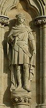 The town arose as the wealth and fame of the abbey grew. After the Norman conquest of England in 1066, the abbot planned out over 300 new houses within a grid-iron pattern at a location that was close to the abbey precincts.[22] Edmund's cult was promoted and flourished, but it declined in subsequent years and the saint did not reappear in any liturgical calendars until the appearance of Abbo of Fleury's Passio Sancti Eadmundi in the 12th century.[23] King John is said to have given a great sapphire and a precious stone set in gold to the shrine, which he was permitted to keep upon the condition that it was returned to the abbey when he died.[24]