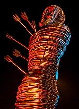 Edmund may have been killed at Hoxne, in Suffolk.[47] His martyrdom is mentioned in a charter that was written when the church and chapel at Hoxne were granted to Norwich Priory in 1101. Place-name evidence has been used to link the name of Hoxne with Haegelisdun,[48] named by Abbo of Fleury as the site of Edmund's martyrdom, but this evidence is dismissed by the historian Peter Warner.[49] The association of Edmund's cult with the village has continued to the present day.[note 3] Dernford in Cambridgeshire[51] and Bradfield St Clare[52][53] (near Bury St Edmunds) are other possible sites for where Edmund was martyred.[note 4] Edmund's death bears resemblance to the fate suffered by St Sebastian, St Denis and St Mary of Egypt.[54]