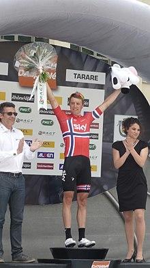 Edvald Boasson Hagen[4] (born 17 May 1987) is a Norwegian professional road racing cyclist, who currently rides for UCI ProTeam Total Direct Énergie.[5] He was ranked as no. 3 in the world by UCI as of 31 August 2009, when he was 22 years old.[6] He is known as an all-rounder, having won the Norwegian National Road Race Championships in 2012,[7] 2015 and 2016. He is also a ten-time winner of the Norwegian National Time Trial Championships.