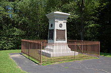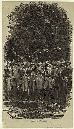 Braddock was buried just west of Great Meadows, where the remnants of the column halted on its retreat to reorganize.[1] He was buried in the middle of the road that his men had just cut through and wagons were rolled over top of the grave site to prevent his body from being discovered and desecrated by the Indians.[3] George Washington presided at the burial service,[3] as the chaplain had been severely wounded.
