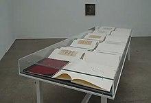 In 1999, the Walker Art Center mounted Edward Ruscha: Editions 1959-1999, a major retrospective of the artist's prints, books, and graphic works, which number well over 300.[66] The show travelled to the LACMA in 2000.[67] Ruscha coauthored the catalogue raisonné with Walker curator Siri Engberg.[68] In July 2012, Reading Ed Ruscha opened at the Kunsthaus Bregenz in Austria.