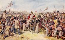 Elizabeth would serve as intermediary between her husband and Afonso, during the Civil War between 1322 and 1324. The Infante greatly resented the king, whom he accused of favoring the king's illegitimate son, Afonso Sanches. Repulsed to Alenquer, which supported the Infante, Denis was prevented from killing his son through the intervention of the Queen. As legend holds, in 1323, Elizabeth, mounted on a mule, positioned herself between both opposing armies on the field of Alvalade in order to prevent the combat. Peace returned in 1324, once the illegitimate son was sent into exile, and the Infante swore loyalty to the king.[4]