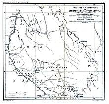 The revolt of Muhammad Ahmad that began in 1881 had cut Equatoria off from the outside world by 1883, and the following year, Karam Allah marched south to capture Equatoria and Emin. In 1885, Emin and most of his forces withdrew further south, to Wadelai near Lake Albert.[1] Cut off from communications to the north, he was still able to exchange mail with Zanzibar through Buganda. Determined to remain in Equatoria, his communiques, carried by his friend Wilhelm Junker, aroused considerable sentiment in Europe in 1886, particularly acute after the death of Gordon the previous year.
