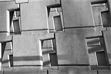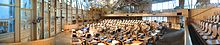 Miralles, like many other postmodern architects, has a preference for piling on the motifs and ideas: upturned boats, keel shapes, deep window reveals like a castle, crow-steps, prow shapes, diagonal gutters, 'bamboo bundles' and above all the dark granite gun-shape that repeats as an ornamental motif at a huge scale. Everywhere broken silhouettes compete for attention, just like the alleyways next door. That's fine, and contextual, but it's quite a meal. As a result of the complexity, the parliament is really a kind of small city, with much too much to digest in one short three-hour sitting. The Scottish parliament will take time to judge: maybe not 50 years but three or four visits, long enough to absorb all the richness and get used to those jumpy black granite guns, the most arbitrary of several questionable ornaments.[3]