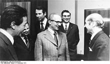 During his leadership, he distanced the party from the influence of the Communist Party of the Soviet Union and pursued a moderate line, repositioning the party within Italian politics and advocating accommodation and national unity.[3][4] This strategy came to be termed Eurocommunism and he was seen as its main spokesperson.[5] It would come to be adopted by Western Europe's other significant communist parties, in Spain and later France, its significance as a political force cemented by a 1977 meeting in Madrid between Berlinguer, Georges Marchais and Santiago Carrillo.[6] Berlinguer himself described his "alternative" model of socialism, distinct from both the Soviet bloc and the capitalism practiced by Western countries during the Cold War, as the terza via or "third way",[7] although his usage of the term has no relation to the more centrist Third Way practiced by subsequent Prime Ministers Romano Prodi and Matteo Renzi.