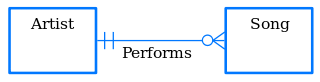 Two related entities shown using Crow's Foot notation. In this example, an optional relationship is shown between Artist and Song; the symbols closest to the song entity represents "zero, one, or many", whereas a song has "one and only one" Artist. The former is therefore read as, an Artist (can) perform(s) "zero, one, or many" song(s).