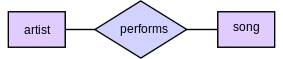 With this notation, relationships cannot have attributes. Where necessary, relationships are promoted to entities in their own right: for example, if it is necessary to capture where and when an artist performed a song, a new entity "performance" is introduced (with attributes reflecting the time and place), and the relationship of an artist to a song becomes an indirect relationship via the performance (artist-performs-performance, performance-features-song).