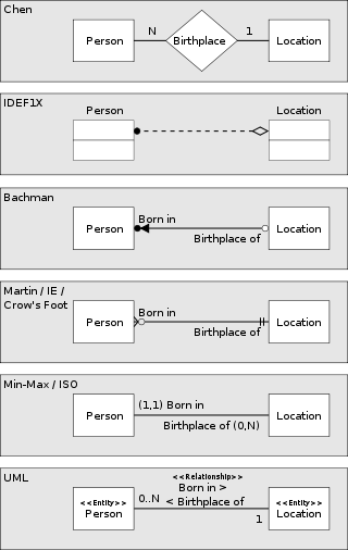 Various methods of representing the same one to many relationship. In each case, the diagram shows the relationship between a person and a place of birth: each person must have been born at one, and only one, location, but each location may have had zero or more people born at it.