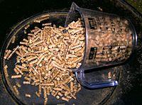 Many feed manufacturers combine various grains and add additional vitamin and mineral supplements to create a complete premixed feed that is easy for owners to feed and of predictable nutritional quality.[20] Some of these prepared feeds are manufactured in pelleted form, others retain the grains in their original form. In many cases molasses is used as a binder to keep down dust and for increased palatability.[7] Grain mixes with added molasses are usually called "sweet feed" in the United States and "coarse mix" in the United Kingdom. Pelleted or extruded feeds (sometimes referred to as "nuts" in the UK) may be easier to chew and result in less wasted feed. Horses generally eat pellets as easily as grain. However, pellets are also more expensive, and even "complete" rations do not eliminate the necessity for forage.[33]