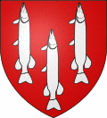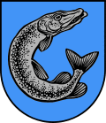 In heraldry, the pike is called a lucy (English heraldry) or a ged (Scottish heraldry).[3] It is usually blazoned either naiant (swimming), embowed (bowed) or hauriant (jumping), though pairs of lucies may appear addorsed (back to back), as in the arms of the Finnish town of Uusikaupunki (Argent, two lucies addorsed azure).