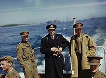 The 49th Division, another first-line TA formation, had previously fought in the Norwegian Campaign in April 1940, although it had left behind the divisional troops and only two of its three brigades, the 146th and 148th, both poorly-trained and equipped, and the divisional HQ, had fought. After evacuating from Norway, two of the division's brigades, the 146th and 147th, had been sent to garrison Iceland, not returning to the United Kingdom until 1942, whereby the division was reconstituted, now with the 70th Brigade replacing the 148th.[32] As it had been stationed in Iceland, the division's insignia was that of a polar bear. Barker, however, believed the original design, featuring the polar bear with its head facing downwards, made the animal look too timid and had it changed into a more aggressive-looking animal. The new design featured the bear with its head thrown back and roaring.[32] By the time Barker became GOC, the 49th "Polar Bears" Division had been selected to join the British Second Army, then commanded by Lieutenant General Sir Kenneth Anderson, which was formed in July to take part in the Allied invasion of Normandy, then scheduled for May 1944. The division formed part of I Corps, then under Lieutenant General Gerard Bucknall, later replaced in August 1943 by Lieutenant General John Crocker. As a result, the division undertook training in amphibious warfare, mainly in Scotland. Whilst he was there Barker, nicknamed "Bubbles", apparently gained a reputation as a "demon for physical fitness and field training", according to Captain A. P. Whitehead of the 70th Brigades' 1st Battalion, Tyneside Scottish, who further wrote that "under his command the whole Division rapidly became a battleschool".[38] On 1 January 1944 Barker was made a Companion of the Order of the Bath (CB).[39]