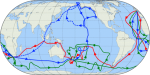 Ferdinand Magellan (1480–1521), was the first navigator to cross the Pacific Ocean, discovering the Strait of Magellan, the Tuamotus and Mariana Islands, and achieving a nearly complete circumnavigation of the Earth, in multiple voyages, for the first time. Juan Sebastian Elcano (1476–1526), completed the first global circumnavigation.