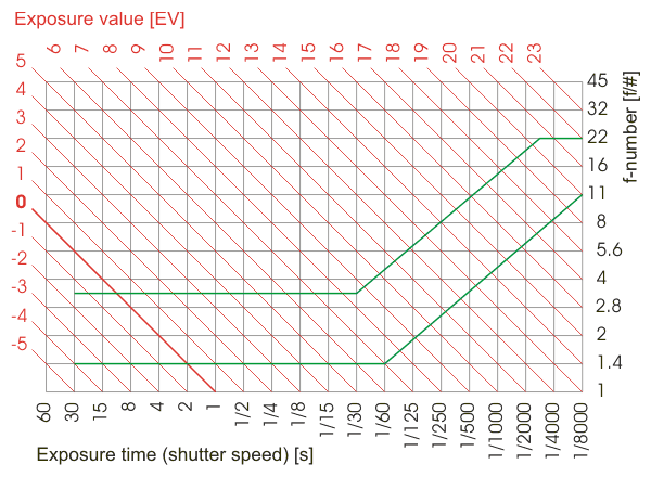 EV 0 corresponds to an exposure time of 1 s and an aperture of f/1.0. If the EV is known, it can be used to select combinations of exposure time and f-number, as shown in Table 1.