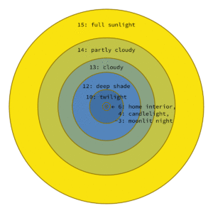Lighting condition EV100 Daylight Light sand or snow in full or slightly hazy sunlight (distinct shadows)a 16 Typical scene in full or slightly hazy sunlight (distinct shadows)a, b 15 Typical scene in hazy sunlight (soft shadows) 14 Typical scene, cloudy bright (no shadows) 13 Typical scene, heavy overcast 12 Areas in open shade, clear sunlight 12 Outdoor, natural light Rainbows Clear sky background 15 Cloudy sky background 14 Sunsets and skylines Just before sunset 12–14 At sunset 12 Just after sunset 9–11 The Moon,c altitude > 40° Full 15 Gibbous 14 Quarter 13 Crescent 12 Blood 0 to 3[6] Moonlight, Moon altitude > 40° Full −3 to −2 Gibbous −4 Quarter −6 Aurora borealis and australis Bright −4 to −3 Medium −6 to −5 Milky Way galactic center −11 to −9 Outdoor, artificial light Neon and other bright signs 9–10 Night sports 9 Fires and burning buildings 9 Bright street scenes 8 Night street scenes and window displays 7–8 Night vehicle traffic 5 Fairs and amusement parks 7 Christmas tree lights 4–5 Floodlit buildings, monuments, and fountains 3–5 Distant views of lighted buildings 2 Indoor, artificial light Galleries 8–11 Sports events, stage shows, and the like 8–9 Circuses, floodlit 8 Ice shows, floodlit 9 Offices and work areas 7–8 Home interiors 5–7 Christmas tree lights 4–5