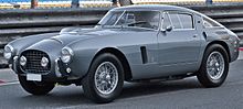 The 250 Europa, introduced at the 1953 Paris Motor Show, was the only one of the family to use a different engine, sporting the 2963 cc Lampredi V12 based on a design for Formula One 3.3 L engine. It was a square engine, with 68 mm (2.7 in) of bore and stroke, developing 200 PS (147 kW; 197 hp) at 6,300 rpm, with three Weber 36DCF (or DCZ) carburettors, and mated to a 4-speed transmission. With the long 2,800 mm (110.2 in) wheelbase and Ferrari 375 America-style bodies, it was designed as a grand tourer. Three different rear axle ratios were offered to customers, providing an estimated top speed between 180–217 kilometres per hour (112–135 mph) depending on the ratio.[7] Both 250 Europa and 375 America shared the same chassis, wheelbase and mechanicals apart for the engine.[8] The bodywork was designed by Giovanni Michelotti and constructed by Pinin Farina and Vignale. Styling resembled the 375 America and 340 Mexico coupes.[7] 22 were made, including 17 Pinin Farina-built coupes, 4 Vignale coupes, 1 Pinin Farina cabriolet and 1 Vignale cabriolet.[9] Two later were later converted by the Ferrari factory to 375 America specification (chassis 0315AL and 0353EU).[10][11]