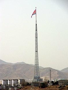 A 270-kilogram (600 lb) North Korean national flag flies from a tall flagpole, which is located at Kijŏng-dong, on the North Korean side of the Military Demarcation Line within the Korean Demilitarized Zone. The flag-pole is 160 meters (520 feet) tall.[15]