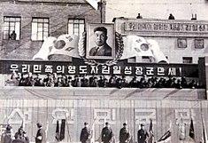 The design of the flag was disclosed, along with a draft constitution, on 1 May 1948.[14] On 10 July 1948 the new flag was approved by the provisional People's Assembly of North Korea. The following month Kim, who formerly supported the traditional design, wrote a reasoned text On the Establishing of the New National Flag and the Abolition of Taegukgi. Thereby he explained the decision to adopt a new flag against the wishes of those who favored the old one. In terms of North Korean official texts, Kim's account is unequivocally frank in acknowledging dissenting public opinion. In 1957, Kim Tu-bong was purged by Kim Il-sung who by that time had erected a cult of personality. Any mention of the use of Taegukgi was removed from texts and it was doctored out of photographs on the orders of Kim Il-sung who sought to monopolize North Korean history to serve him and his regime. Contemporary official North Korean accounts now posit that the new flag of North Korea as personally designed by Kim Il-sung.[10]