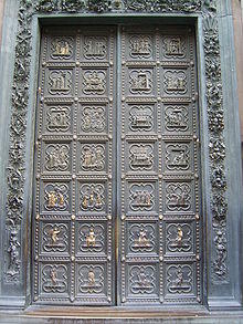 The Baptistery is renowned for its three sets of artistically important bronze doors with relief sculptures. The south doors were created by Andrea Pisano and the north and east doors by Lorenzo Ghiberti.[3] Michelangelo dubbed the east doors the Gates of Paradise.