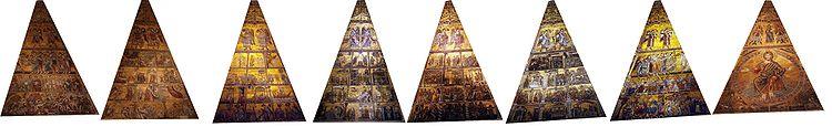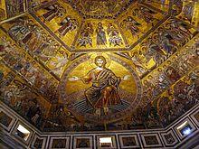 The Baptistery is crowned by a magnificent mosaic ceiling. It was created over the course of a century in several different phases. The oldest parts are the upper zone of the dome with the hierarchy of angels (2,3), the Last Judgment on the three western segments of the dome (1) and the mosaic above the rectangular chapel on the western side. An inscription in the mosaic above the western rectangular chapel states the date of the beginning of the work and the name of the artist. According to this inscription, work on the mosaic began in 1225 by the Franciscan friar Jacobus. The artist was previously falsely identified to be the Roman mosaicist Jacopo Torriti, who was active around 1300. In accordance with his style, Jacobus was trained in Venice and strongly influenced by the Byzantine art of the early to mid-thirteenth century. Since the inscription also names Emperor Frederick II, the inscription and the completion of the first phase of mosaics must fall within the Ghibelline phase of Florentine rule between 1238 and 1250.[17]