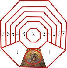 It was once believed that the Baptistery was originally a Roman temple dedicated to Mars,[5] the tutelary god of the old Florence. The chronicler Giovanni Villani reported this medieval Florentine legend in his 14th-century Nuova Cronica on the history of Florence.[6] Excavations in the 20th century have shown that there was a 1st-century Roman wall running through the piazza with the Baptistery, which may have been built on the remains of a Roman guard tower on the corner of this wall, or possibly another Roman building including a second-century house which was restored in the late 4th or early 5th century.[7][a] It is certain that an initial octagonal baptistery was erected here in the late 4th or early 5th century. It was replaced or altered by another early Christian baptistery in the 6th century. Its construction is attributed to Theodolinda, queen of the Lombards (570–628), to seal the conversion of her husband, King Authari.