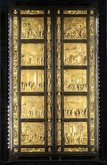 In 1401, a competition was announced by the Arte di Calimala (Cloth Importers Guild) to design doors which would eventually be placed on the north side of the baptistery. (The original location for these doors was the east side of the baptistery, but the doors were moved to the north side of the baptistery after Ghiberti completed his second commission, known as the Gates of Paradise.)[8]