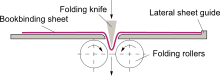A knife folder works by striking the paper with a knife between two rollers. This knife is not sharp enough to cut through the paper and simply strikes and creases the paper along the line where the fold is required.[1] Ideally, knife folding is used with thick paper, for "cross folds" (commonly employed for maps and also known as a "French fold")[5] or if the paper has been stitched during the folding process; stitched sheets can ruin high friction rollers.