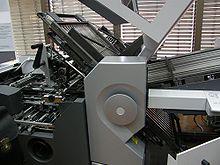 A folding machine is a machine used primarily for the folding of paper. Folding is the sharp-edged bending of paper webs or sheets under pressure at a prepared or unprepared bending point along a straight line according to specified dimensions and folding layouts.[1] Paper can be folded with either a buckle or a knife; thus, there are generally three types of folding machines: buckle folders, knife folders or a combination of these two types.[1][2] Whilst buckle folding is the more popular of the two methods, knife folding is sometimes preferable. Folding machine models vary in sophistication, with high-end machines capable of processing more complex folding jobs and unusual paper forms (in terms of density and size).[3][4] Organizations required to undertake mass mail-out campaigns often employ folding machines to improve efficiency.[4] However it is very commonly used finishing process across the printing industry.[1]