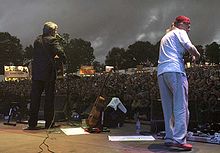 On 20 July 1965, Dylan released the groundbreaking "Like a Rolling Stone", a six-minute-long scathing put-down, directed at a down-and-out society girl, which again featured Dylan backed by an electric rock band.[95][96] Released just as the Byrds' cover of "Mr. Tambourine Man" topped the charts in the United States, the song was instrumental in defining the burgeoning folk rock scene and in establishing Dylan as a bona fide rock star, rather than a folksinger.[95] "Like a Rolling Stone" managed to reach the Top 5 on both sides of the Atlantic.[92][97] Five days after the release of "Like a Rolling Stone", on 25 July 1965, Dylan made a controversial appearance at the Newport Folk Festival, performing three songs with a full band.[95] He was met with derisive booing and jeering from the festival's purist folk music crowd,[98] but in the years since the incident, Dylan's 1965 Newport Folk Festival appearance has become widely regarded as a pivotal moment in the synthesis of folk and rock.[95][99][100]