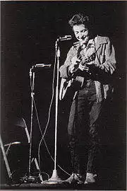 At roughly the same time as these "collegiate folk" vocal groups came to national prominence, a second group of urban folk revivalists, influenced by the music and guitar picking styles of folk and blues artist such as Woody Guthrie, Lead Belly, Brownie McGhee, and Josh White, also came to the fore.[15] Many of these urban revivalists were influenced by recordings of traditional American music from the 1920s and 1930s, which had been reissued by Folkways Records; Harry Smith's Anthology of American Folk Music was particularly influential.[15][16] While this urban folk revival flourished in many cities, New York City, with its burgeoning Greenwich Village coffeehouse scene and population of topical folk singers, was widely regarded as the centre of the movement.[15][17] Out of this fertile environment came such folk-protest luminaries as Bob Dylan,[18] Tom Paxton, Phil Ochs, and Peter, Paul and Mary,[19] many of whom would transition into folk rock performers as the 1960s progressed.[15]