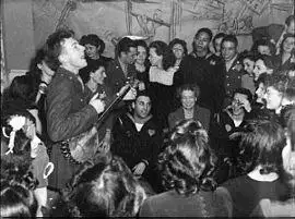 The American folk-music revival began during the 1940s; building on the interest in protest folk singers such as Woody Guthrie and Pete Seeger, it reached a peak in popularity in the mid-1960s with artists such as Bob Dylan and Joan Baez.[9][10] In 1948, Seeger formed the Weavers, whose mainstream popularity set the stage for the folk revival of the 1950s and early 1960s and also served to bridge the gap between folk, popular music, and topical song.[11] The Weavers' sound and repertoire of traditional folk material and topical songs directly inspired the Kingston Trio, a three-piece folk group who came to prominence in 1958 with their hit recording of "Tom Dooley".[11][12] The Kingston Trio provided the template for a flood of "collegiate folk" groups between 1958 and 1962.[13][14]