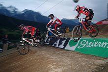Four-cross (4X), also called mountain-cross, not to be confused with fourcross, is a relatively new style of mountain bike racing where four bikers race downhill on a prepared, BMX-like track, simply trying to get down first. These bikes are generally either full suspension with 140mm to 160mm of travel, or hardtails, and typically have relatively strong frames. They run a chainguide on front and gears on the back. They have slack head angles, short chainstays and low bottom brackets for good cornering and acceleration. In recent years the tracks raced on have been rougher and less like those used in BMX.