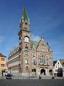 In 1893, a new town hall was erected in the center of the town at Masaryk Square according to plans by Franz Neumann, a Viennese architect. Inside the town hall is a bust of Albrecht von Wallenstein, created by a sculptor from nearby Raspenava. The building has stained glass windows and the exterior has statues of Self-Sacrifice and Justice. Now, the town museum, Frýdlant City Museum, is located on the second floor with archaeological and historical exhibits.[13][14]