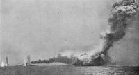 As soon as the turret had been hit the captain had ordered Q magazine doors closed and the magazine flooded, the order passing to the Transmitting Station below the armoured deck where Stoker 1st Class William Yeo was entrusted with passing the order on. The magazine was consequently flooded and locked up within minutes of the hit. However the cordite charges which had fallen down from gun house after the hit were not removed to safety, and there were still ready charges in the working chamber. A large number of crewmen still remained in the shell room, magazine handing room and working chamber. The fire which was thought to have been put out after the hit on the turret gained strength and ignited the remaining cordite charges, setting off a large explosion at 16:28 which killed the turret crewmen, the flame of the explosion reaching as high as the top of the ship's masts. Even with the precautions taken in hand, the magazine doors were later found to be severely buckled – only the seawater in the magazine behind it prevented the blast reaching inside.[18] Other ships of the battlecruiser fleet were less lucky; at about the same time as Harvey's death, HMS Indefatigable was torn to pieces by a series of magazine explosions that claimed 1,013 lives and just minutes after that HMS Queen Mary exploded "like a puffball" in one huge column of grey smoke, killing 1,275 sailors.[19] Hours later during the main battlefleet engagement, Rear-Admiral Horace Hood's flagship HMS Invincible was destroyed with 1,032 lives. All three ships were lost as the result of magazine explosions similar to the one narrowly avoided on Lion.[19]