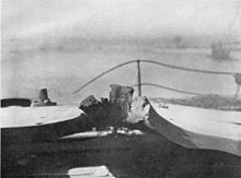 Beatty's battlecruisers led the British fleet in its attack, casting south into the North Sea to find the enemy during the afternoon of 31 May 1916. At 14:15, scouting cruisers spotted the German vanguard and Beatty closed to attack the enemy with his main force. Given time to prepare, Hipper was ready for Beatty with his battlecruisers in line to face Beatty's approaching ships with their full broadsides. Hipper was also encouraged by the main German battleship fleet under Vice-Admiral Reinhard Scheer, which was steaming northwards close behind him. At 15:45 Beatty came within range of the German fleet and the vanguards engaged one another with their opening fusillades.[12] As the two squadrons closed, the Germans found the range better and faster than the British, who were silhouetted against the sun. As a result, German shells pounded the British ships while the German ships remained untouched for the first 10 minutes of the engagement.[12] During this stage of the battle Lion was hit by nine shells from SMS Lützow.[13] One shell at 16:00 struck the right upper corner of the left hand gun port at the junction of the face plate and the roof, and punched a piece of the 9-inch face plate into the turret before detonating, blowing off the armoured roof of the turret and starting a fire, which a damage control party working from outside the turret fought to put out.[14]